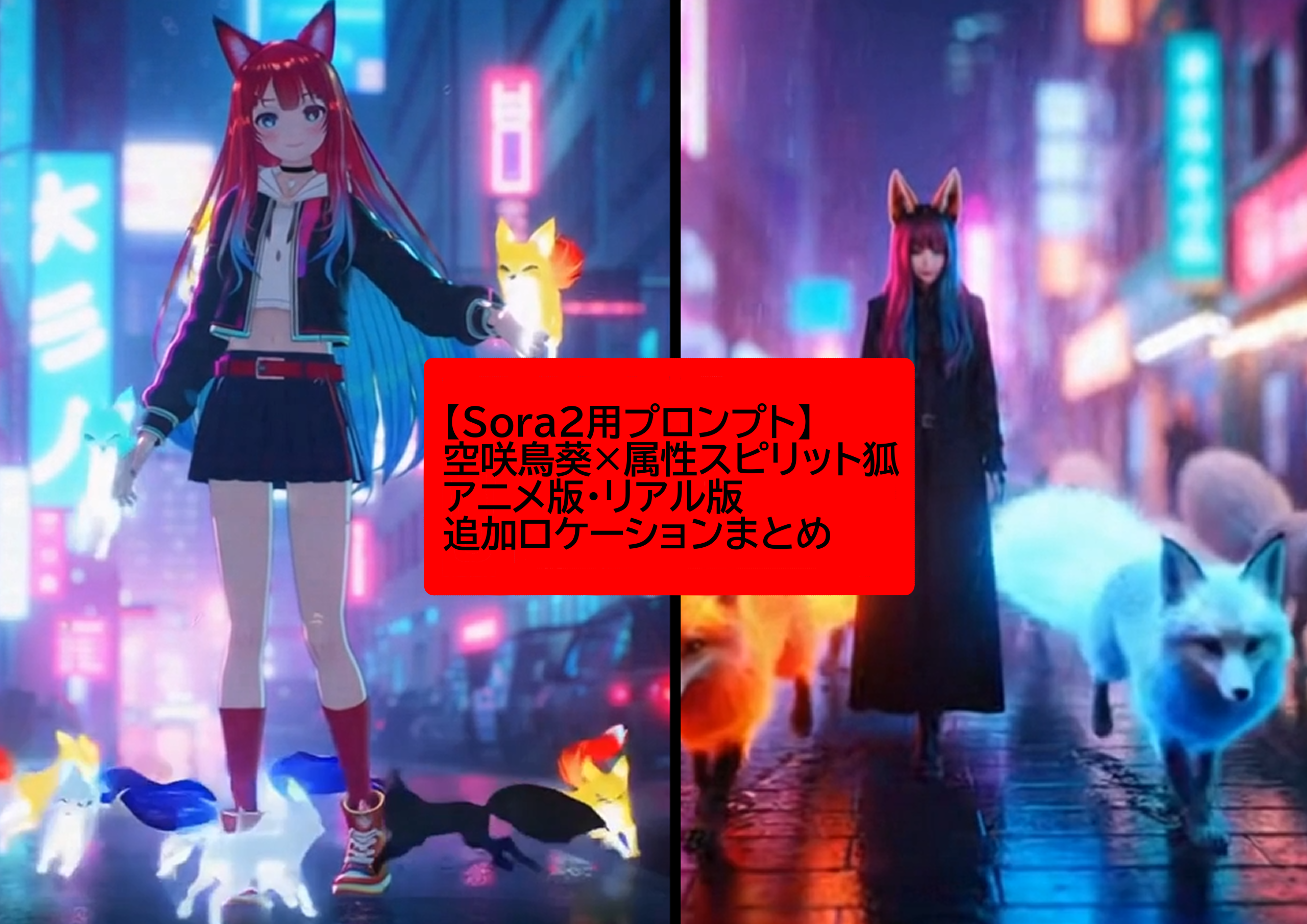 【Sora2用プロンプト】空咲鳥葵×属性スピリット狐|アニメ版・リアル版・追加ロケーションまとめ
